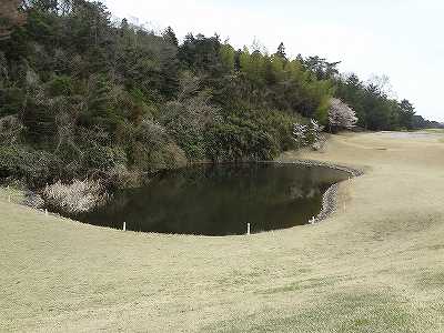 ティーグランドやや左前方に池があり、ちょっとだけ池越えっぽいですが、120ヤードで越えるので、チョロしない限りは入らない池です。
