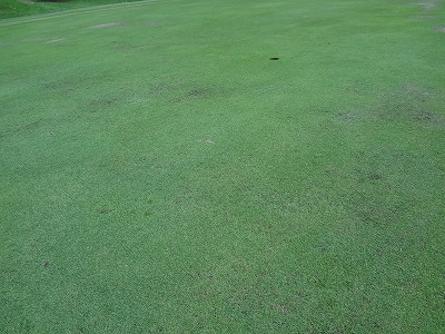 泥が露出していたり、芝が腐ったようになっていたり、腐ったところに大量の砂を撒いてあったりして、ひどいところは、グリーン面の1/4くらい?ががそんな状態だったところも・・・。