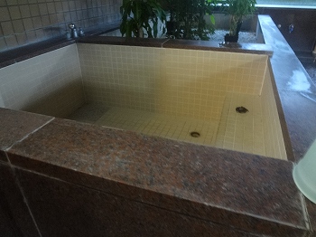 水風呂の横にも、浴槽がありますが、玉砂利で埋められ、観葉植物が置いてありました。→