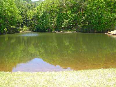No.6 □373yard Par 4 左ドッグレッグの、ちょっとトリッキーなパー4。 さらに、セカンドショット地点付近から急激な下りになっている完全なブラインドホール。 セカンド地点付近まで行ってみないと、どんな風になっているか?よくわからないホールです。 セカンドショット地点付近から下っていて、ティーグランドからはまったく見えないため、打ち込み防止用の鐘あり。 幅はやや狭く、ティーショットがちょっと立ちづらかったホール。 ティーマークが右方向を向いていて、左サイドが狭く見えるので、広そうな右サイドへ打ってしまいがちですが、右サイドのOBラインが浅いので、ちょっと右にでてしまうと、斜面を下ってすぐOBなので、注意が必要です。 特設ティーあり。 実は、見えない左サイドの方が、(上っている)土手になっていてけっこう広くなっています。 なので、狙い目は左の山裾方向なのですが、ちょっと狙いづらい・・・。 セカンドショット地点手前付近。 このあたりから、左へ折れていて、急な下り。 さらに、グリーン左手前に池があります! 左足下がりのライからのコントロールが要求されるので、距離を残してしまった場合は、右手前の花道方向を狙うのが安全。 池は、グリーン手前から左サイドにかけて広がっていて、この日のピンは、左いっぱいに設定されてました! グリーンはやや砲台形で大きく、ポテトチップ状グリーンです。 この池の水は、けっこう透き通っていてきれい! 池の奥は、ひっそりとした高原の雰囲気があり、人工でなく、自然の池のような感じです! グリーンの右奥には、紅葉したモミジが・・・。 緑とのコントラストがきれいでした!(^^