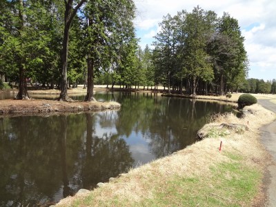 この巨大な池は、12番、14番がらみの部分の池の縁が大きな白っぽい石砂利で、最初みたときは、”大きな川”が流れているのかと思ったのですが、川ではなく、グニャグニャと入り組んだ形状をした池だったのです。