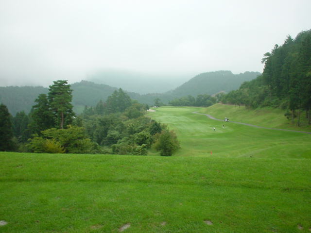 2003年9月7日(日)ラウンド。 この日、「富士一ばんゴルフ」でラウンド予定でしたが、霧でプレー不可能のため、「富士一ばんゴルフ」のスタッフに、このコースを紹介してもらい、急遽、このコースをラウンドすることになったのでした。 中央道近隣コースは、RYOの嫌いな”山岳コース”が多い!というイメージがあり、中央道の帰りの渋滞もあるので、このあたりのコースを自分で予約してプレーすることはまずありません! こういうことでもないと、プレーすることはなかったでしょう!? という意味で、ラウンドしたことのないコースだったので、いい機会と思ってプレーしたのでした!(^^; コースは、山岳コースの部類かな? とはいえ、多くのホールは、山あいに横にレイアウトされている、いわゆる、山に段々畑状に造成されています。 ホールの中での、ものすごい打ち上げホールや打ちおろしホールはありません。 しかし、ホールの左右どちらかが、上へか下への土手(崖)になっていて、ホールの幅が狭いです。特にINは、全体的に幅が狭くて、ブラインドホールも多く、”トリッキー”といえるでしょう! ブラインドホールで、それほどそれていないボールがロストになったりしました!(^^; 初めてのラウンドでは、INは特に狙う方向や距離がわからないので、セルフプレーだと、つらいホールでした!(^^; コースガイドカートに積んでありますが、かなりアバウトなので、ドッグレッグホールで、どのくらい打てば突き抜けるか? クリークが横切っているホールでは、クリークまでの距離などの表示がないので、わからないのです。 基本的にキャディー付プレーのようなので、細かくコースガイドに記載してないのでしょう。 ホールの多くは、片側がOBで、片側が1ペナエリア。 ほとんどのホールに特設ティー(前進4打)が設置されています。 数ホールで多少の打ち下ろしがありますが、アップダウンが比較的に少なく造ってあります。 各ホール内は、段々畑状のため、ホールによって、ややサイドヒル(つま先上がり、つま先下がり)のライが多いという印象。 土手はラフになっているので、ボールが土手の途中に止まることも多く、けっこうきつい傾斜とラフで、脱出のみのショットになる可能性が高くなります。 OUTは、1番から3番くらいは、わりかし横幅も広く、けっこうまともなホールといった感じ。 このコースには、ティーインググランドが、5〜6ヶ所くらいありますが、実際にティーマークが設置されているのは、レディース、レギュラー、バックの3ヶ所。 この日は、はじめてのラウンドだったのでレギュラーティーからラウンド。(ビジターがバックからたプレーできるかは不明。) レギュラーティーは、スコアカードでは、6351ヤードとなっていたので、そこそこの距離があると思ったのですが、実際にレギュラーのティーマークが設置してあったのは、ほとんどのホールで、”フロントティー”。 レギュラーとレディースティーの中間にあるティーでした!(^^;(バックティーが、スコアカードのレギュラーの位置に設置してあった!) そのためトータル距離は、かなり短く、おそらく5800ヤードくらいでは? パー5の多くが450ヤード前後。 パー4の多くは350ヤード以内でした!(^^; スコアカード、ティーインググランドの距離表示は、かなり嘘くさいです!(^^; 450ヤードくらいのパー5で、友人のセカンドショットの残り距離が約150ヤードというのもあった(ドライバーで300ヤード飛んだことになる)ので、ティーインググランド(スコアカード)の距離表示は、全体的にかなり、”さばよんでいる”ような気がします。 おそらく、スコアカードのレギュラーやバックからプレーしたとしても、けっこう短いのは?? ゴルフコースガイドのホームページやガイドブックでは、ほとんどバックティーのトータル距離が掲載されていますが、トータル距離の短い山岳コースでは、よく、”距離が短いコース=せこいコース”というイメージを払拭するため、スコアカードやティーグランドからの距離表示をさばよんで長く表示しているコースがあるのです。 このコースも、ややそんな感じがしました!(^^; ホール内の残り距離表示は、そこそこ正しかったと思いますが、少しドッグレッグホールしているホールでは、左に残り100ヤードの表示杭、その右に150ヤードの表示杭があったりして、ドッグレッグをかみしても、ちょっと極端であやしいような・・・!?(^^; グリーンは、ベントのワングリーン。 アンジュレーションは少ないです。 たしか2段グリーンみたいなグリーンは1つだけ。 18番ホールは、池越えのパー3。 18番がパー3というのも、珍しい!(^^; 105ヤードのところにティーマーク設定。 池越えもほとんどプレッシャーにならない距離でした!(^^; ←7番パー5は、フロントティーから300ヤードくらい?のところをフェアウェイをクリークが横切っていますが、クリークには水は流れていなくて下はコンクリート。 ←9番パー4は、ブラインドホール。308ヤ